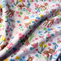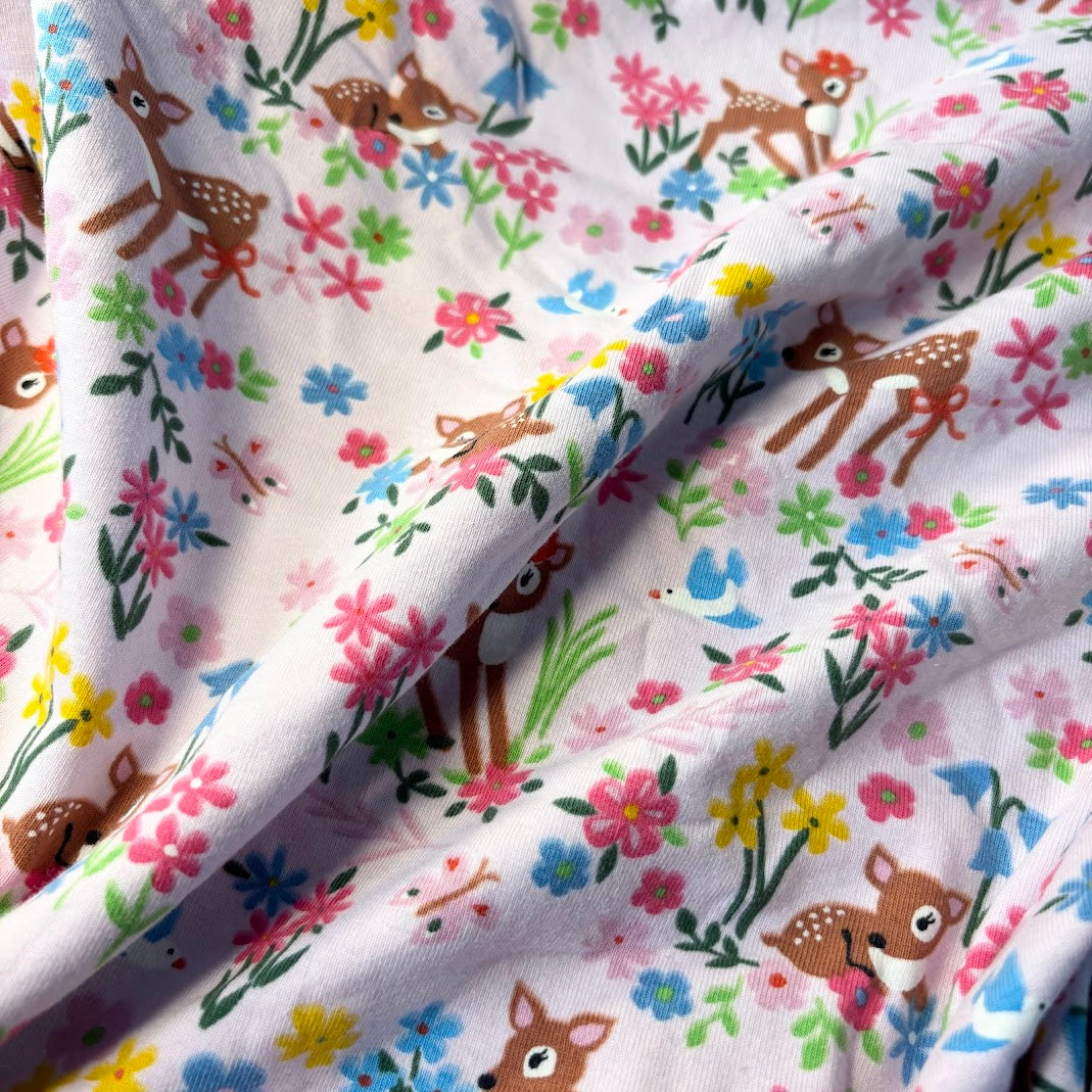 Ett mjukt och följsamt jerseytyg i ljusrosa ton, med vackert motiv av små rådjur, kaniner och fjärilar bland blommor. Tyget har en sagolik känsla och blir en fin detalj i barnets garderob. Perfekt för dig som vill sy något unikt och lekfullt som samtidigt är skönt att bära.