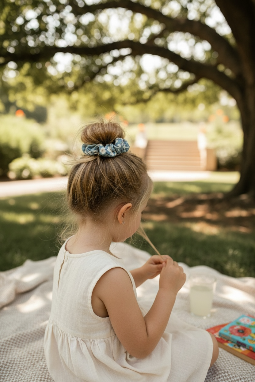 Ge barnets frisyr det där lilla extra med vår vackra scrunchie i flera olika färgglada tyger! Sydda i mjuka, ekologiska och/eller oekotex-certifierade jerseytyger som är både skonsam mot håret och bekväm att bära hela dagen. Hårbandet blir en fin accessoar för både vardag och fest i håret eller som armband runt handleden.
