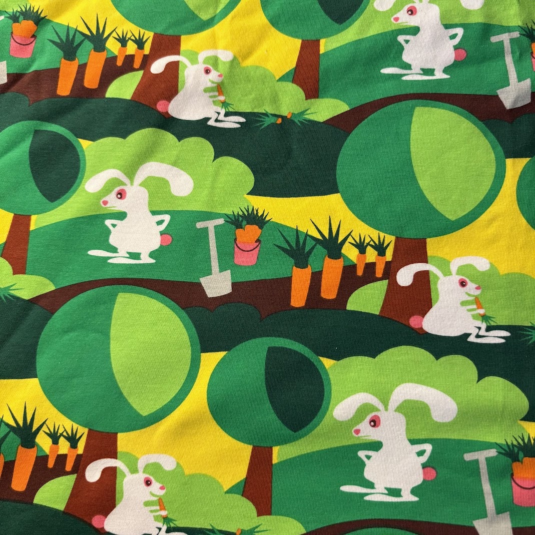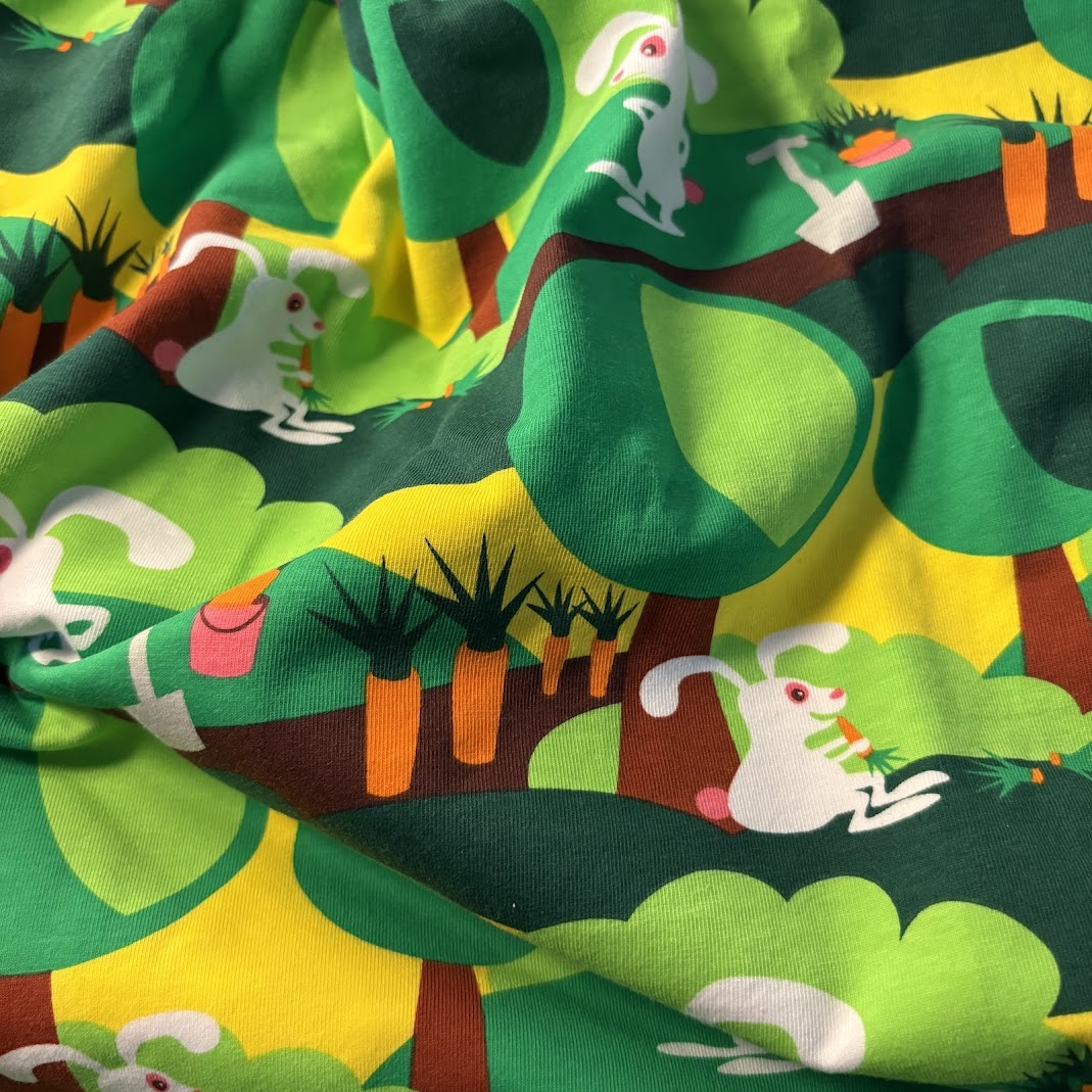 Ett härligt färgglatt jerseytyg med roliga, tecknade kaniner på grön och gul botten. Tyget har ett lekfullt mönster som sprider glädje – perfekt för barn som gillar starka färger och busiga motiv.
